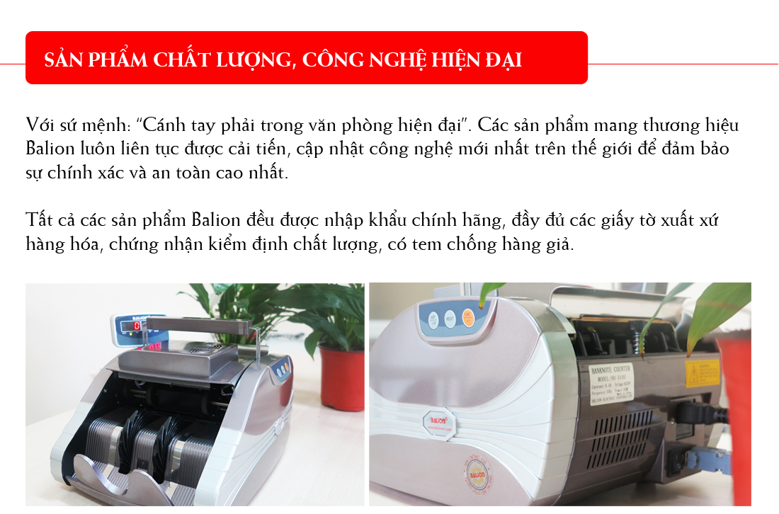 Tại sao bạn nên chọn máy đếm tiền Balion? Balion chân thành cảm ơn quý khách hàng đã quan tâm đến sản phẩm của chúng tôi. Sau đây là những lý do, tại sao bạn nên chọn máy đếm tiền và thiết bị ngân hàng Balion: