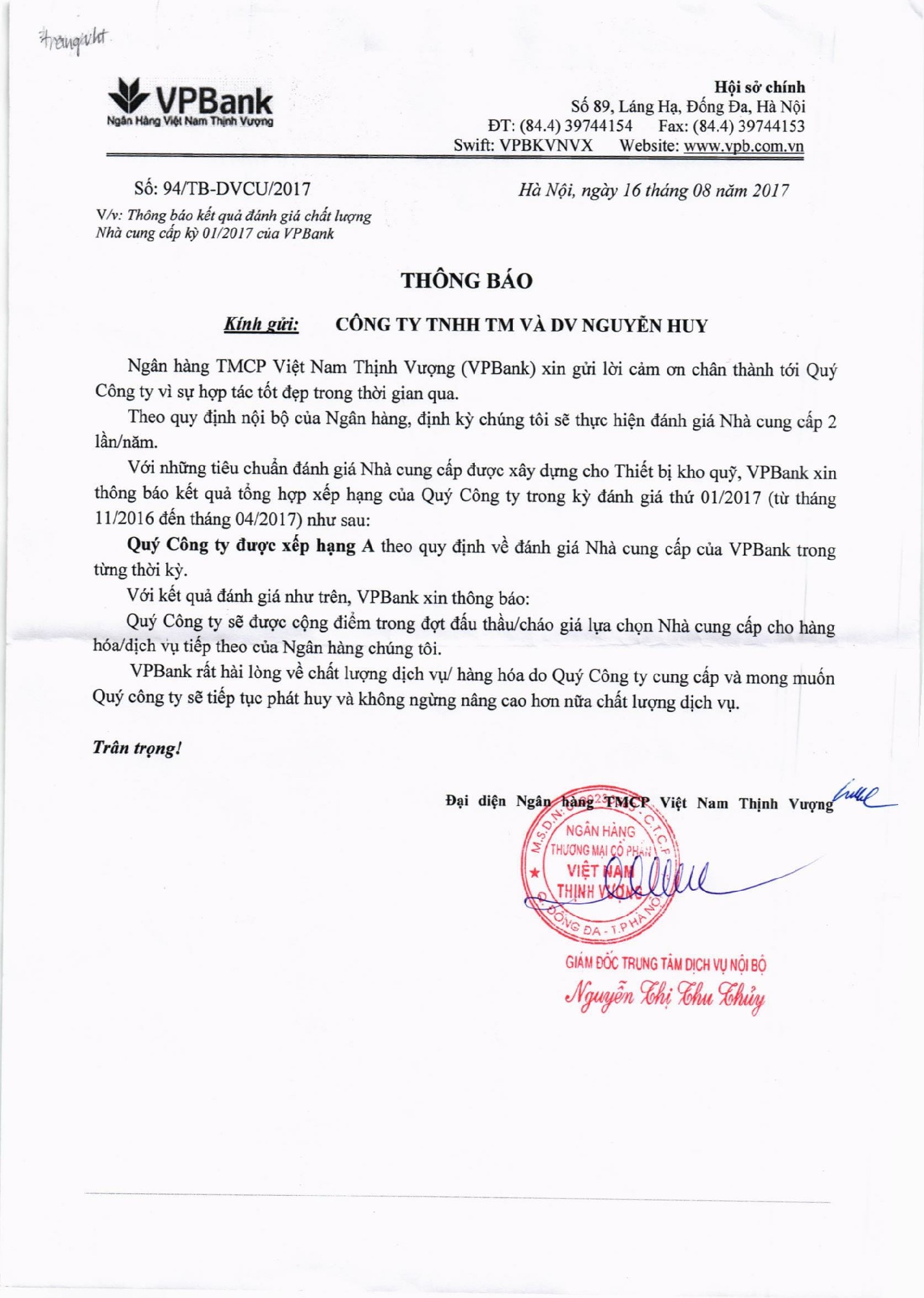 Dưới đây là văn bản chính thức do VPBank gửi cho nhà cung cấp thiết bị kho quỹ Balion - Công ty TM&DV Nguyễn Huy: